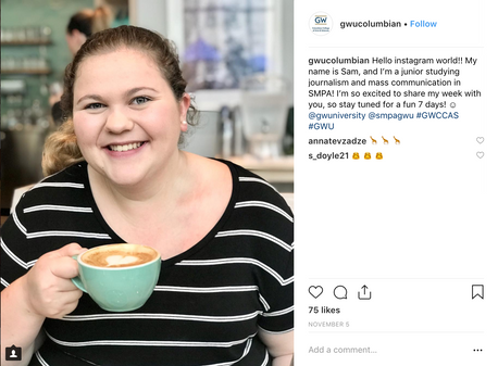 The George Washington University asked Samantha to manage the Instagram for their Columbian College of Arts and Sciences (@gwucolumbian) account during a week in November 2018 in efforts to showcase her involvement and life at GW.